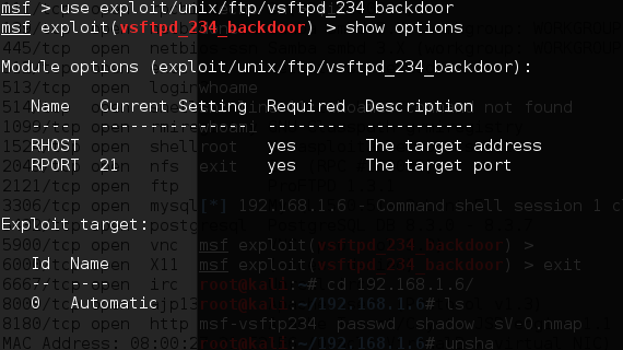 Ahora que tenemos nuestro script lo seleccionamos ejecutando use exploit/unix/ftp/vsftpd_234_backdoor . A continuación lanzamos un show options para ver que parámetros necesita el script.