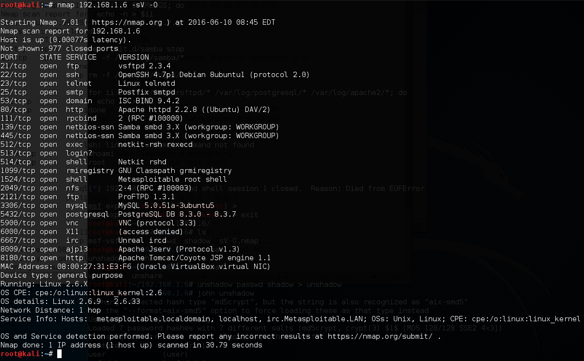 Buenos, manos a la obra. Ya tenemos nuestro laboratorio montado y conocemos la IP de nuestra victima (en mi caso la 192.168.1.6). Lo primero que vamos a hacer es un nmap para ver por dónde empezar. Le activamos el flag -sV para que nos muestre el footprinting de los servicios y el flag -O para la versión del sistema operativo.